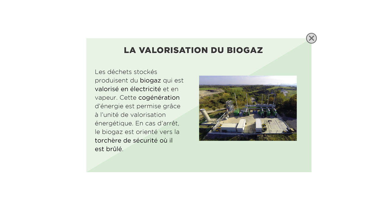 Le biogaz est produit par les déchets qui, en se décomposant, libèrent du gaz majoritairement composé de méthane. Ce biogaz est acheminé par aspiration jusqu’à l’UVE.