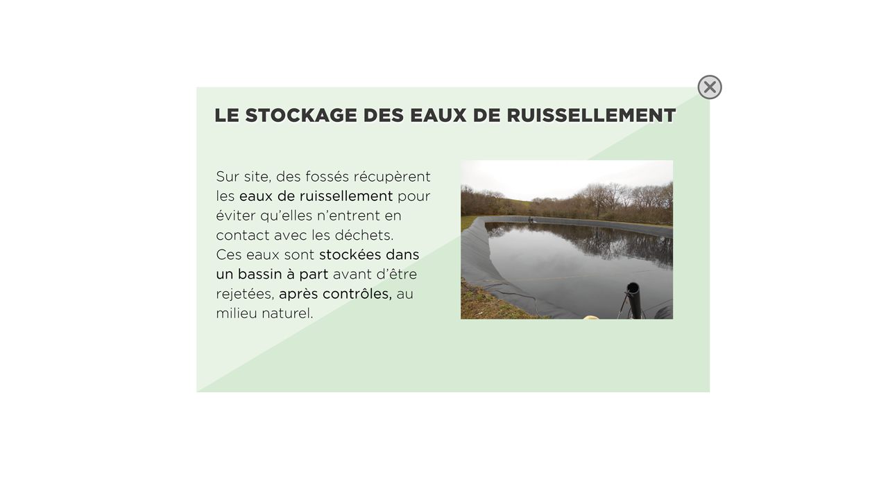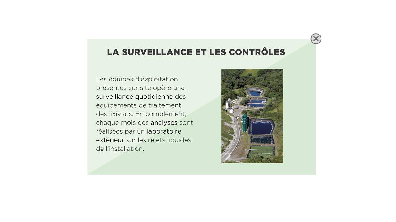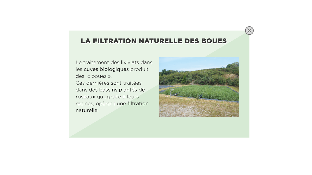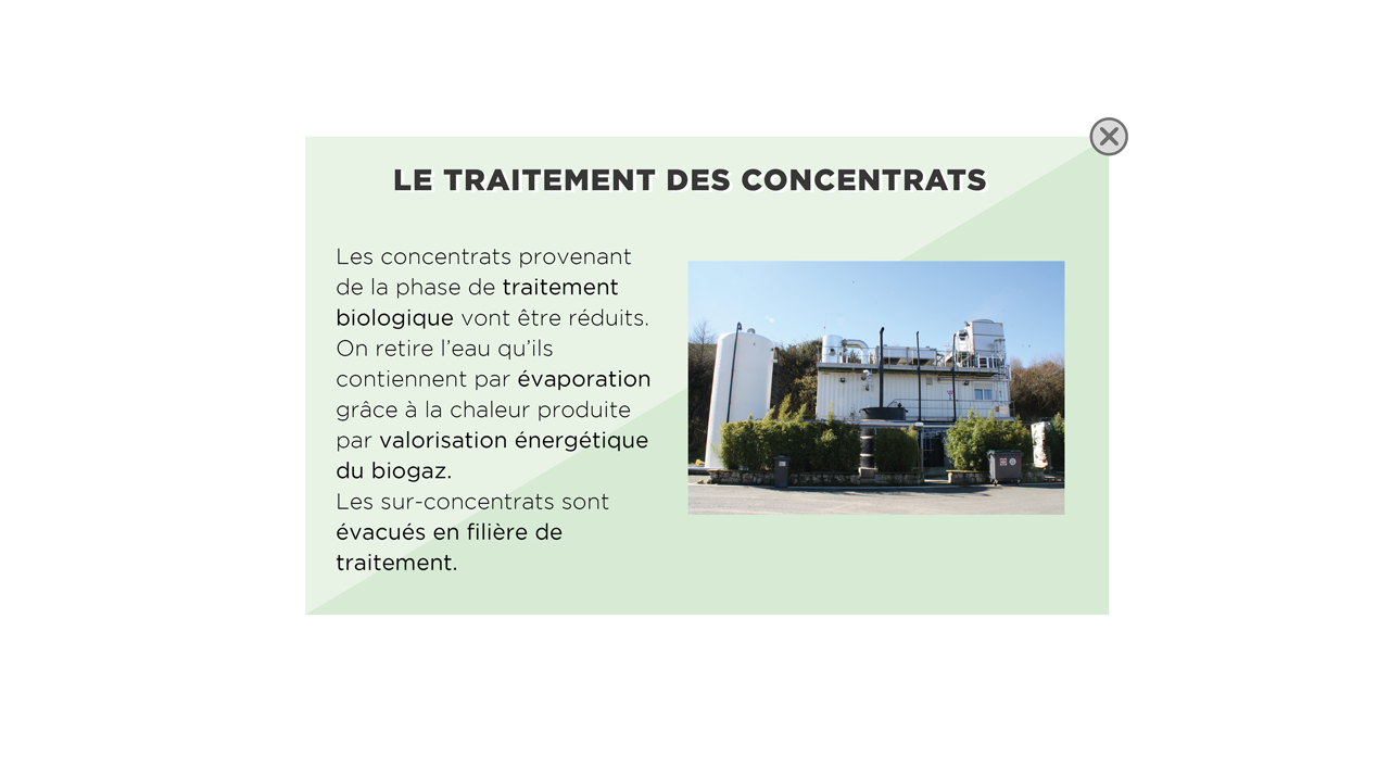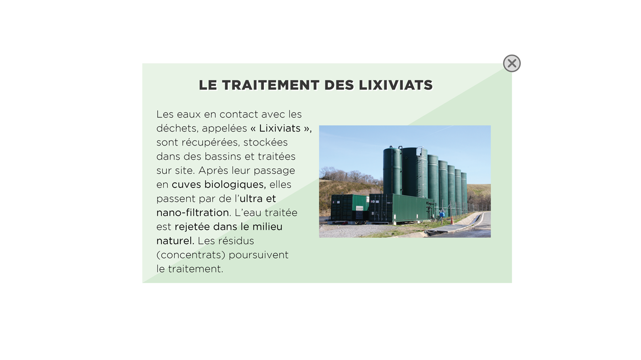 Les lixiviats (eaux sales) sont récupérés dans des bassins de stockage de 8 100 m3 grâce à un système de drainage installé dans les alvéoles d’enfouissement des déchets. Ils sont traités en deux étapes. La première étape est dite biologique. Les lixiviats passent dans différentes cuves où des bactéries neutralisent et dégradent les pollutions présentes. Ils sont ensuite filtrés en plusieurs fois pour retirer les matières en suspension. Ce qu’il reste de cette phase est appelé « concentrat ». Cette fraction va subir un processus dit d’évaporation sous vide pour retirer l’eau qu’elle contient. Le « sur-concentrat » obtenu est évacuée en filière spécialisée.